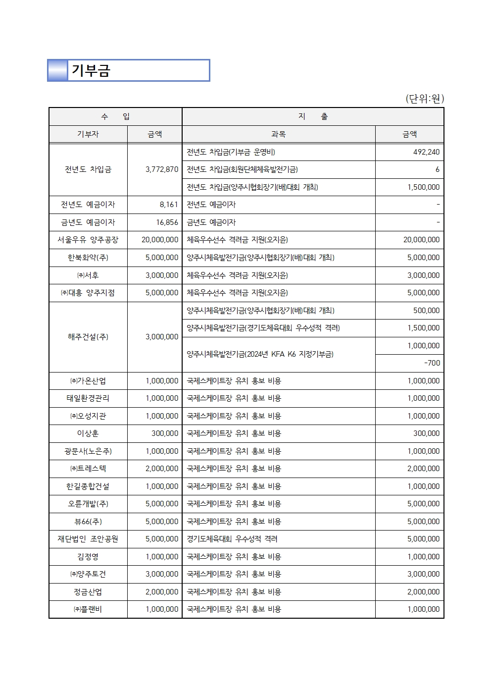 2024 2024년 양주시체육회 기부금 수입 및 사용내역